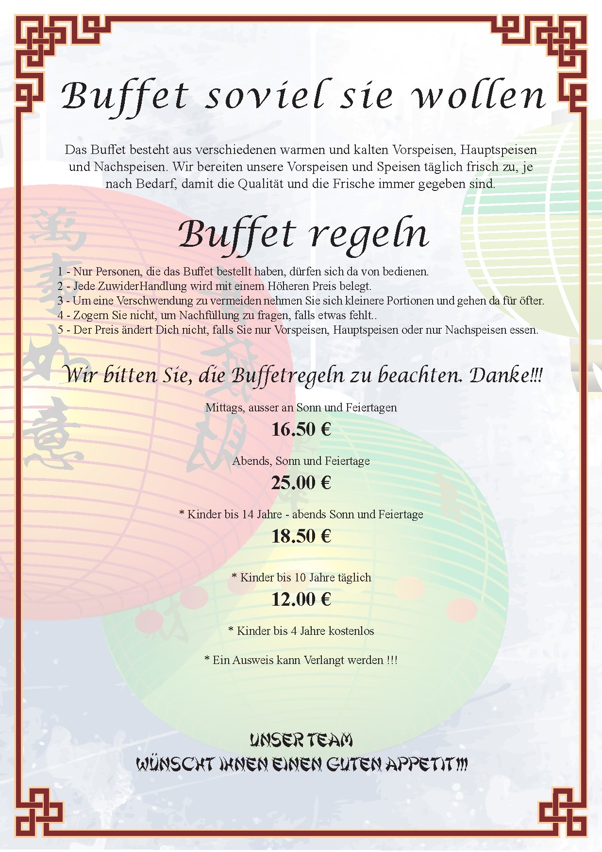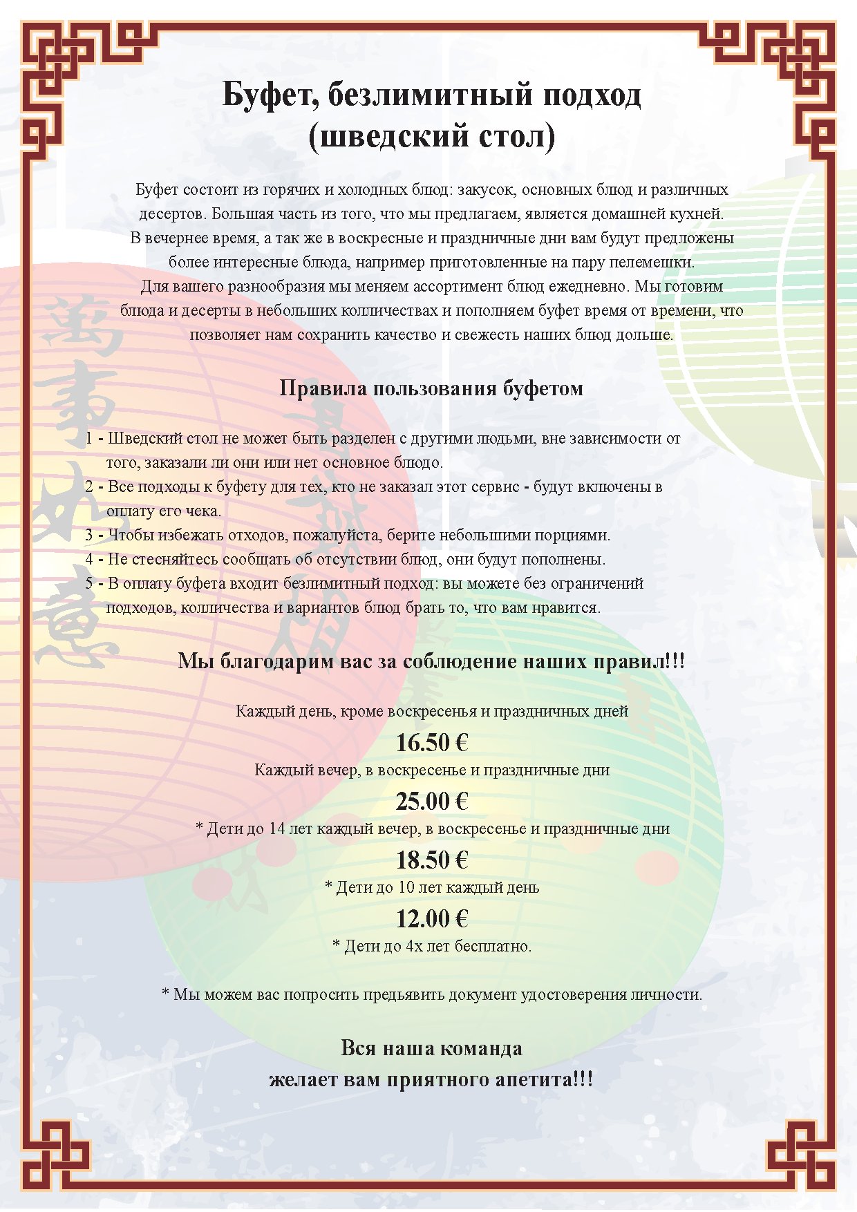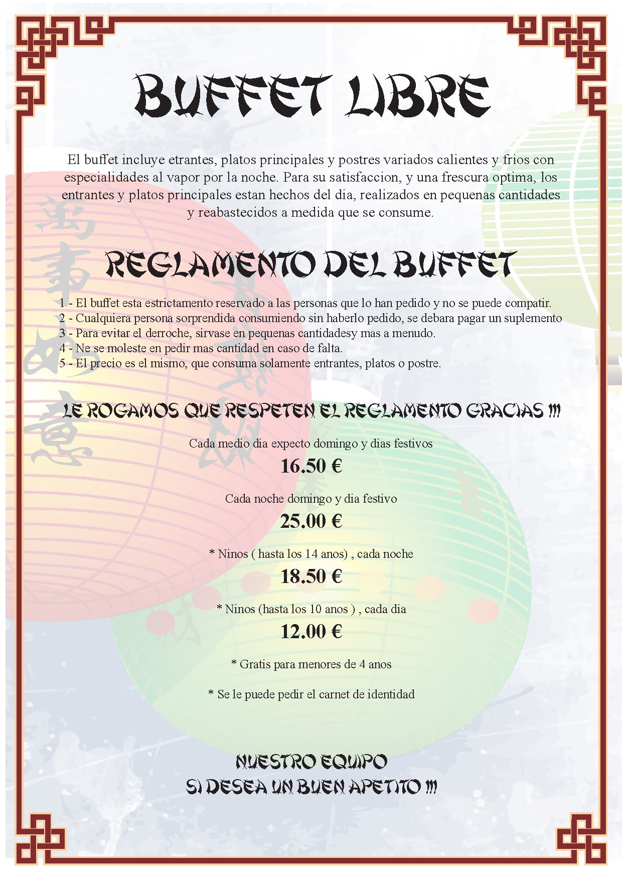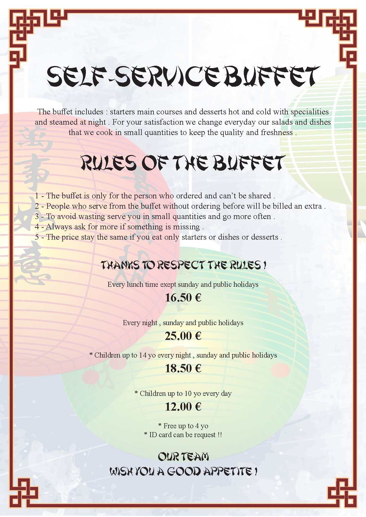 Le Buffet à Volonté vous permet d’avoir un choix plus variés, une idée de nos spécialités chinoises et asiatiques tout en mangeant à votre rythme et à votre convenance pour un tarif unique.